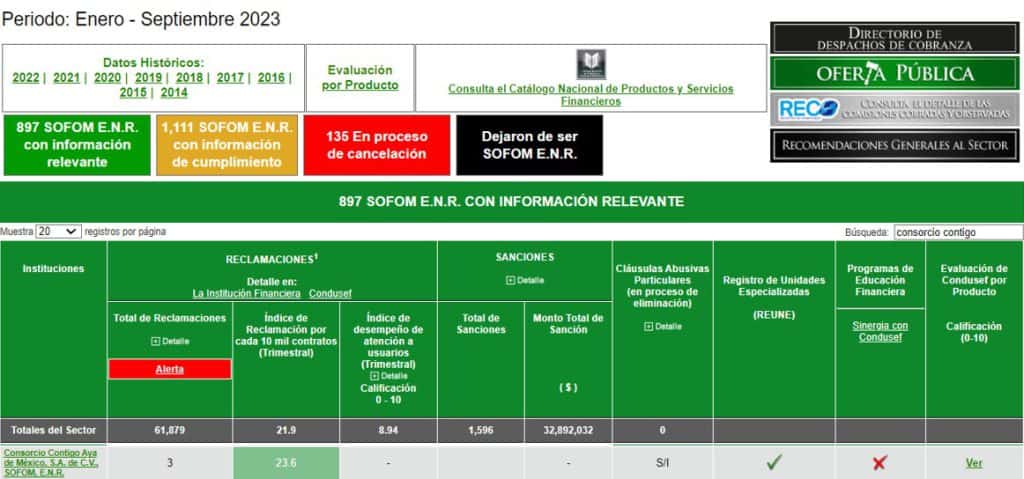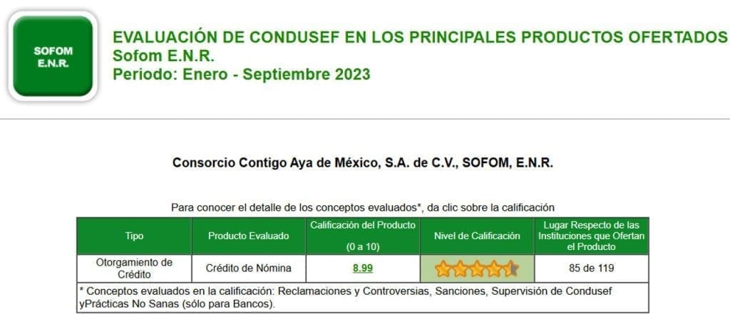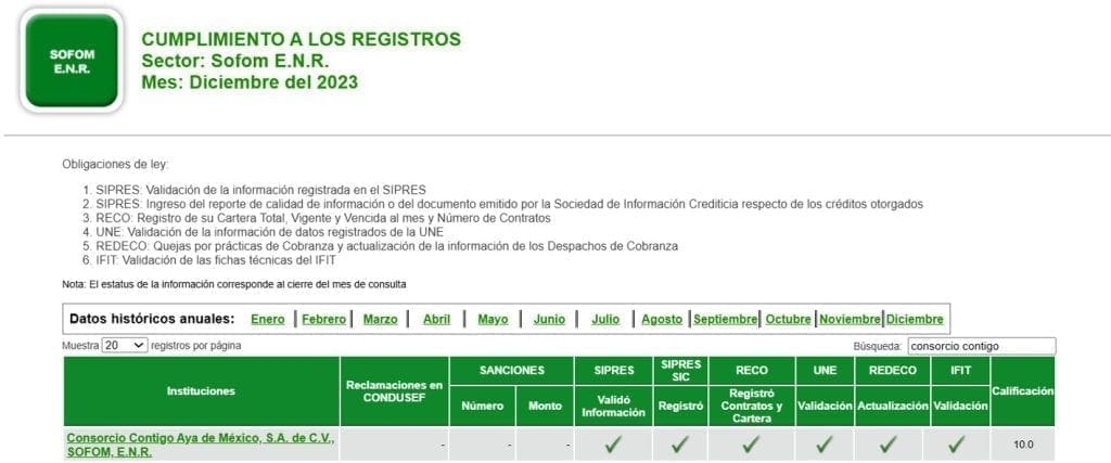 La información de esta sección corresponde únicamente a Consorcio Contigo Aya de México, S.A. de C.V., SOFOM, E.N.R. Para conocer la información de todo el sector a la que esta Institución Financiera corresponde, se podrá acceder al sitio web del Buró de Entidades Financieras: http://www.buro.gob.mx.
